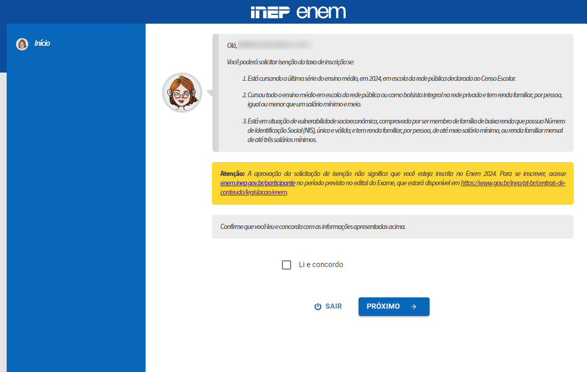 4. A tela seguinte apresentará os critérios para solicitar a isenção da taxa de inscrição. Caso o participante se enquadre nos requisitos, basta clicar em “Li e concordo” e, depois, em “Próximo”.