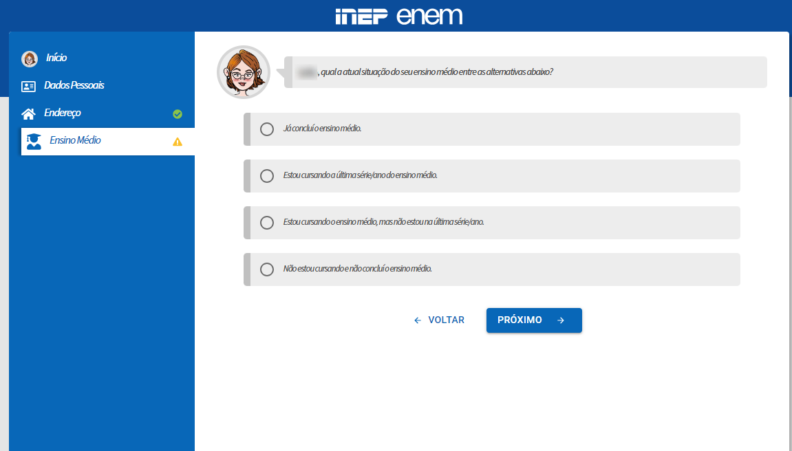 8. A etapa seguinte é referente ao ensino médio. Responda ao questionário e, em seguida, qual tipo de escola frequentou. Clique em “Próximo”.