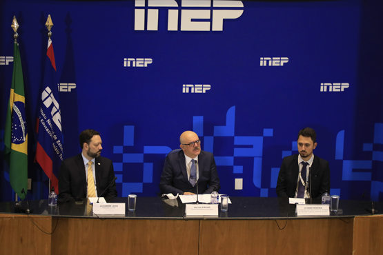 Alexandre Lopes, presidente do Inep; Milton Ribeiro, Ministro da Educação; e Ulysses Tavares, coordenador-geral de controle de qualidade da educação superior substituto. Crédito: Naiara Demarco/CAPES.