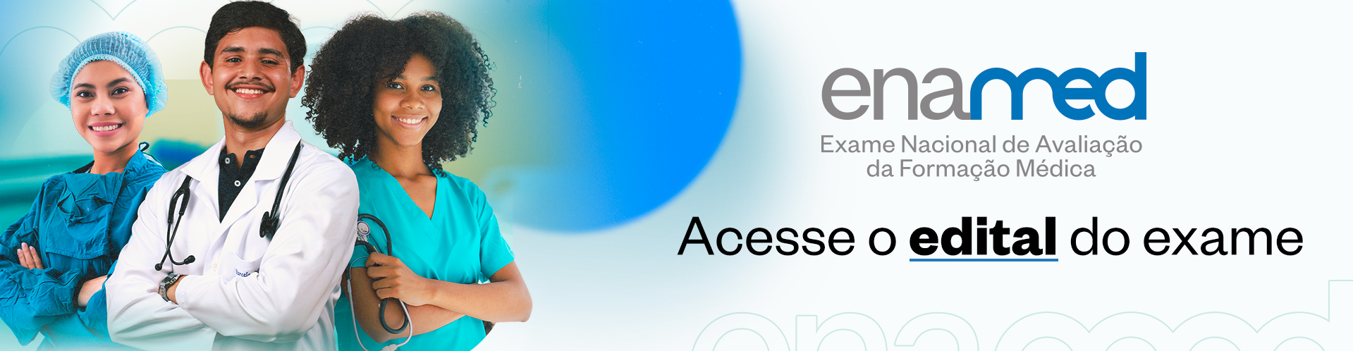 Três profissionais da saúde sorrindo. Texto: Enamed – Acesse o edital do exame.