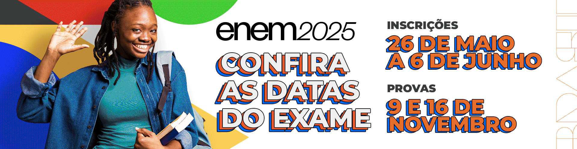Jovem acena sorrindo. Texto: Enem 2025 – Datas do exame, inscrições e dias de prova.