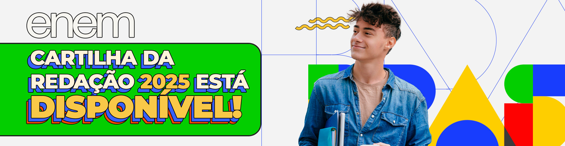 Jovem sorrindo com livros e o texto Cartilha da Redação 2025 está DISPONÍVEL