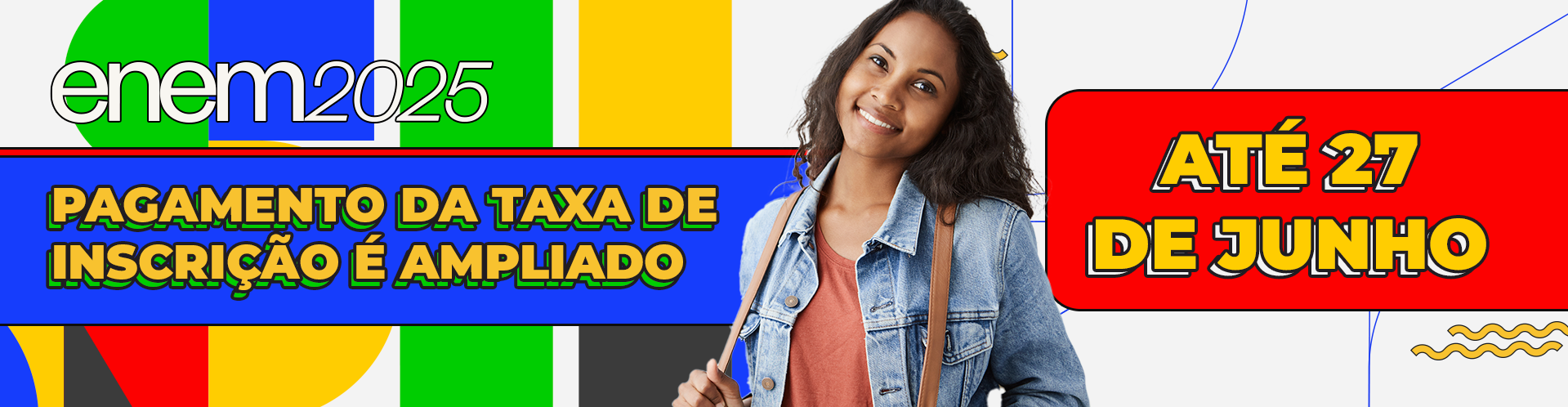 Jovem sorrindo com mochila ao lado de aviso sobre pagamento da taxa do Enem 2025