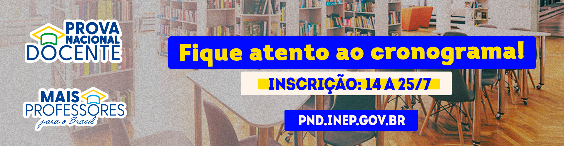 Sala com estantes e carteiras ao fundo e aviso sobre inscrição na Prova Nacional Docente