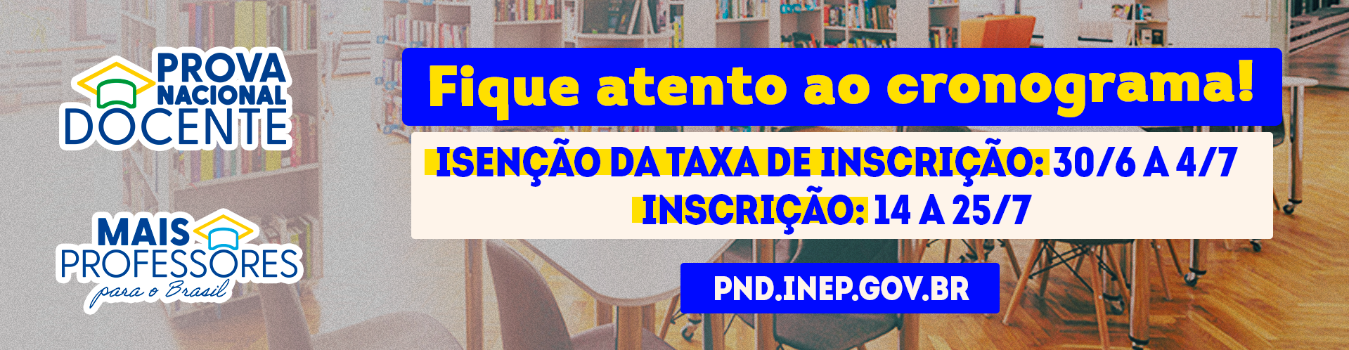 Prova Nacional Docente - Fique atento: isenção da taxa vai até 4/7 e inscrições de 14 a 25/7.