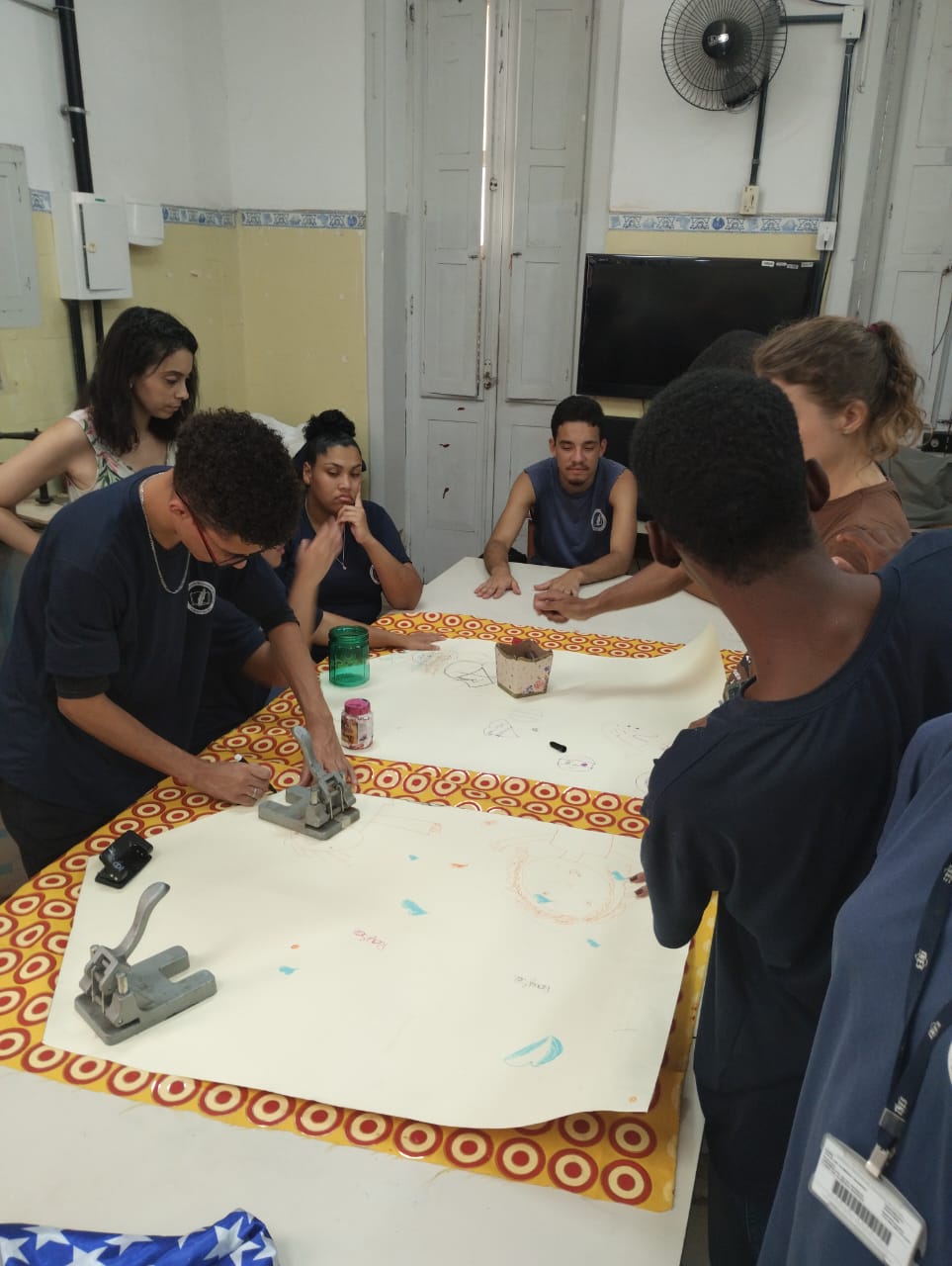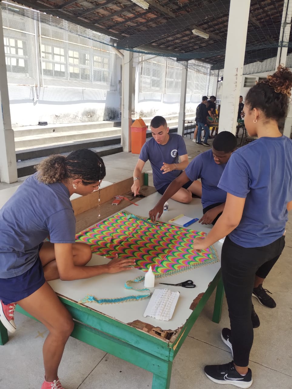 Durante a atividade, os estudantes trabalharam de forma coletiva na criação dos estandartes, exercitando habilidades de expressão visual, cooperação, identidade cultural orientada por professores de diferentes áreas.