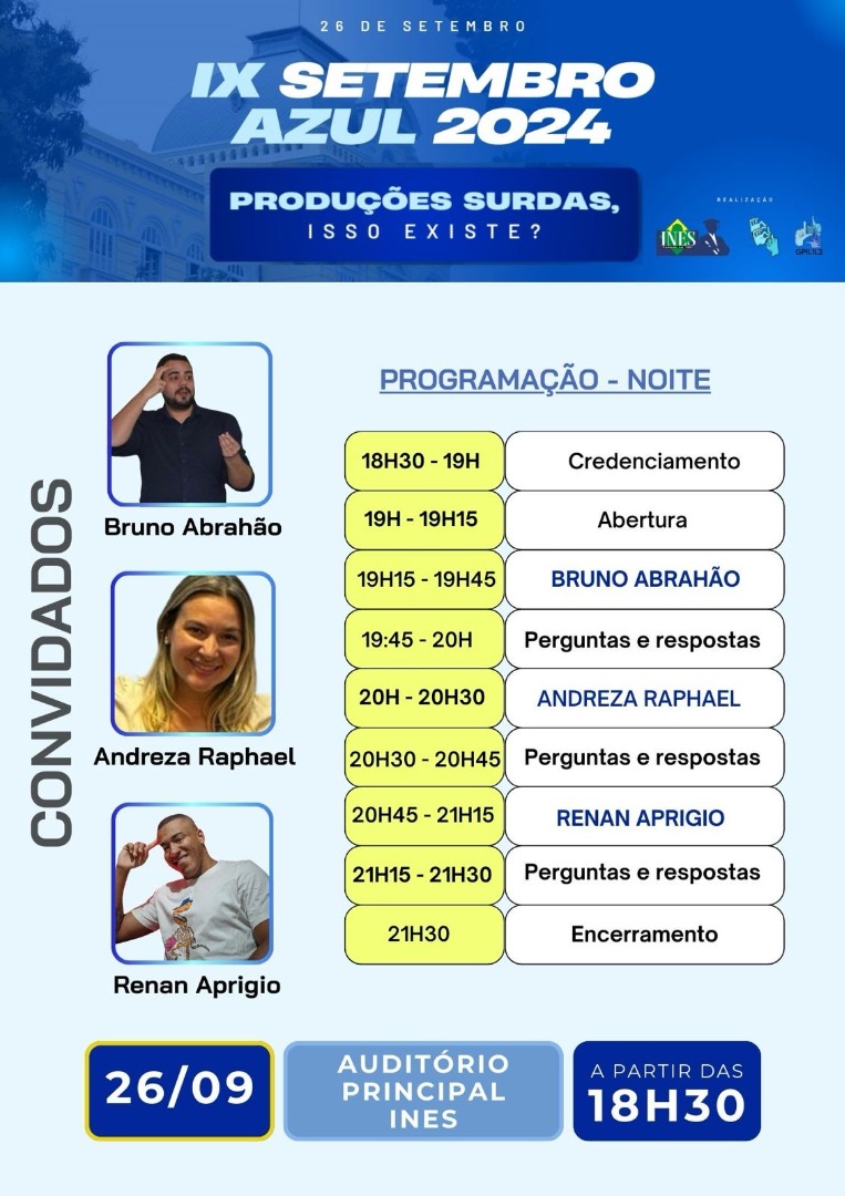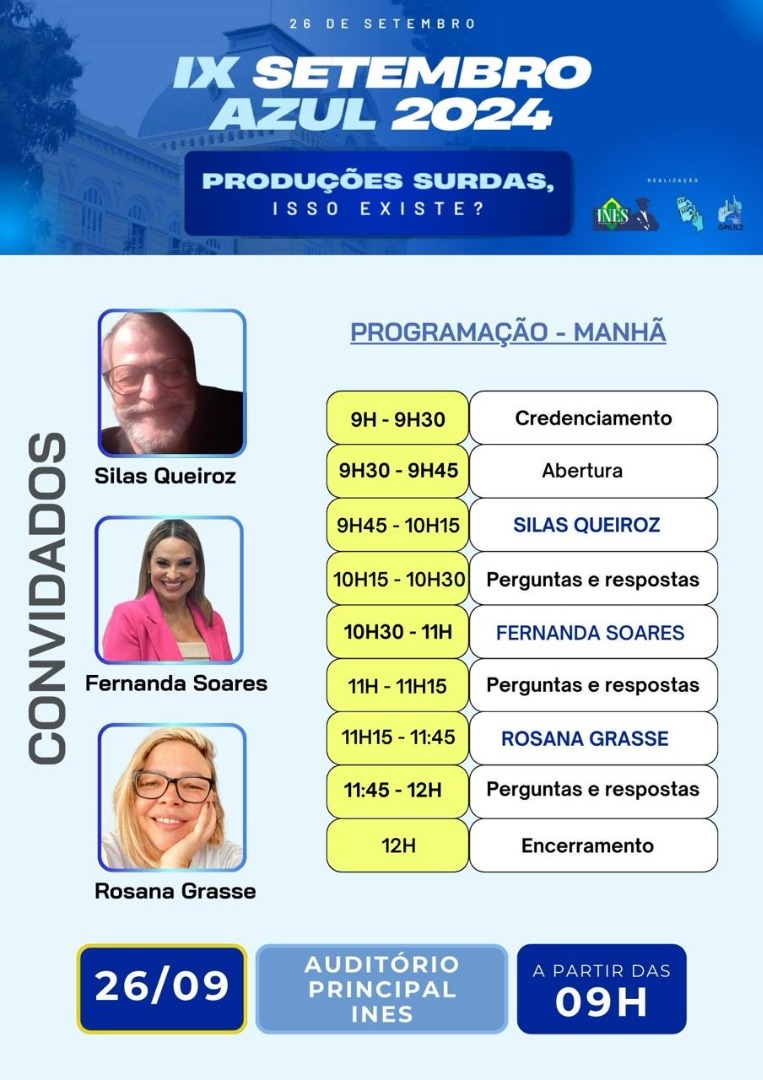 O Departamento do Ensino Superior do Instituto Nacional de Educação de Surdos (INES), por meio do grupo de pesquisa "Instrução de Libras como L1 e L2", abre inscrições para o IX Setembro Azul, evento que acontecerá no dia 26 de setembro, quinta-feira, em celebração ao mês de visibilidade da comunidade surda. Com o tema "Produções Surdas, isso existe?", o encontro será realizado no auditório do prédio principal do INES, em dois horários: das 9h ao meio-dia e das 18 às 21h.