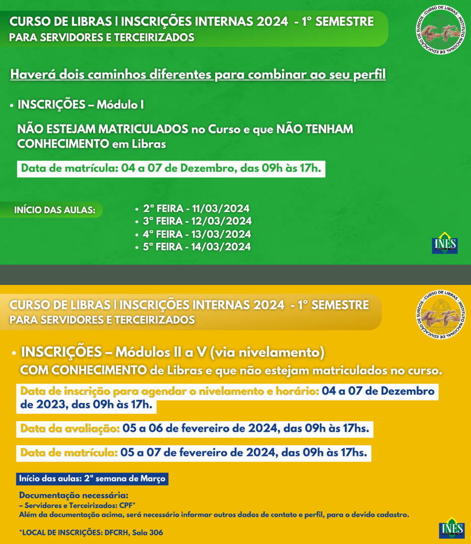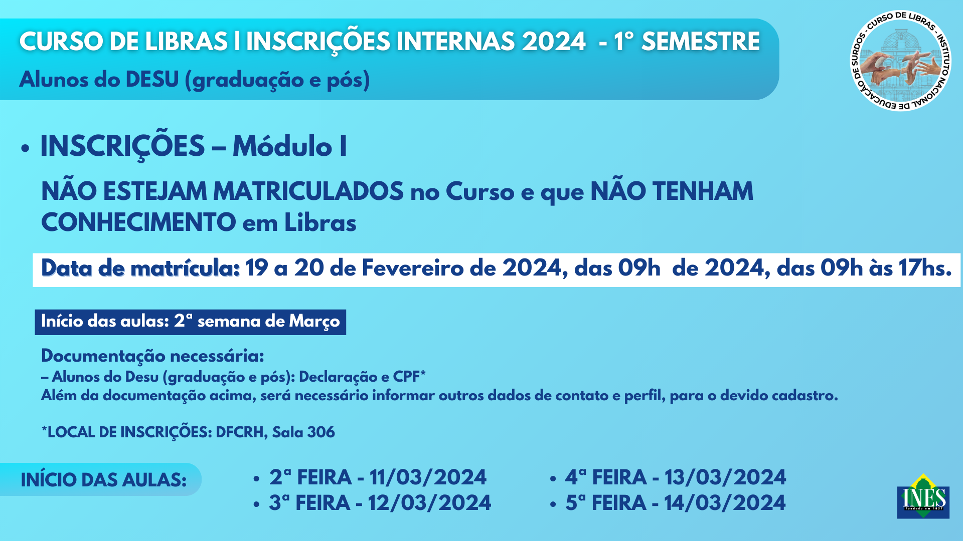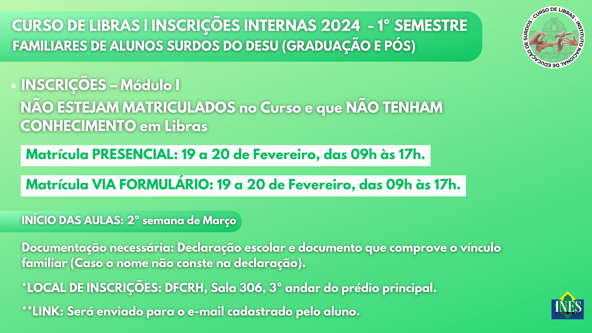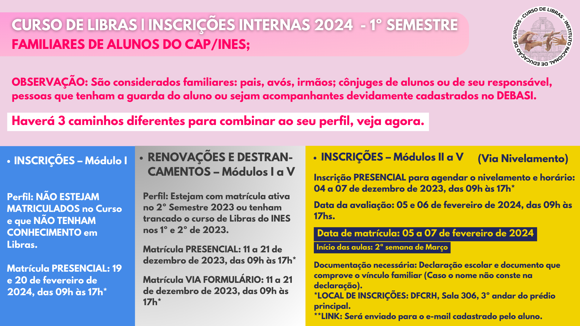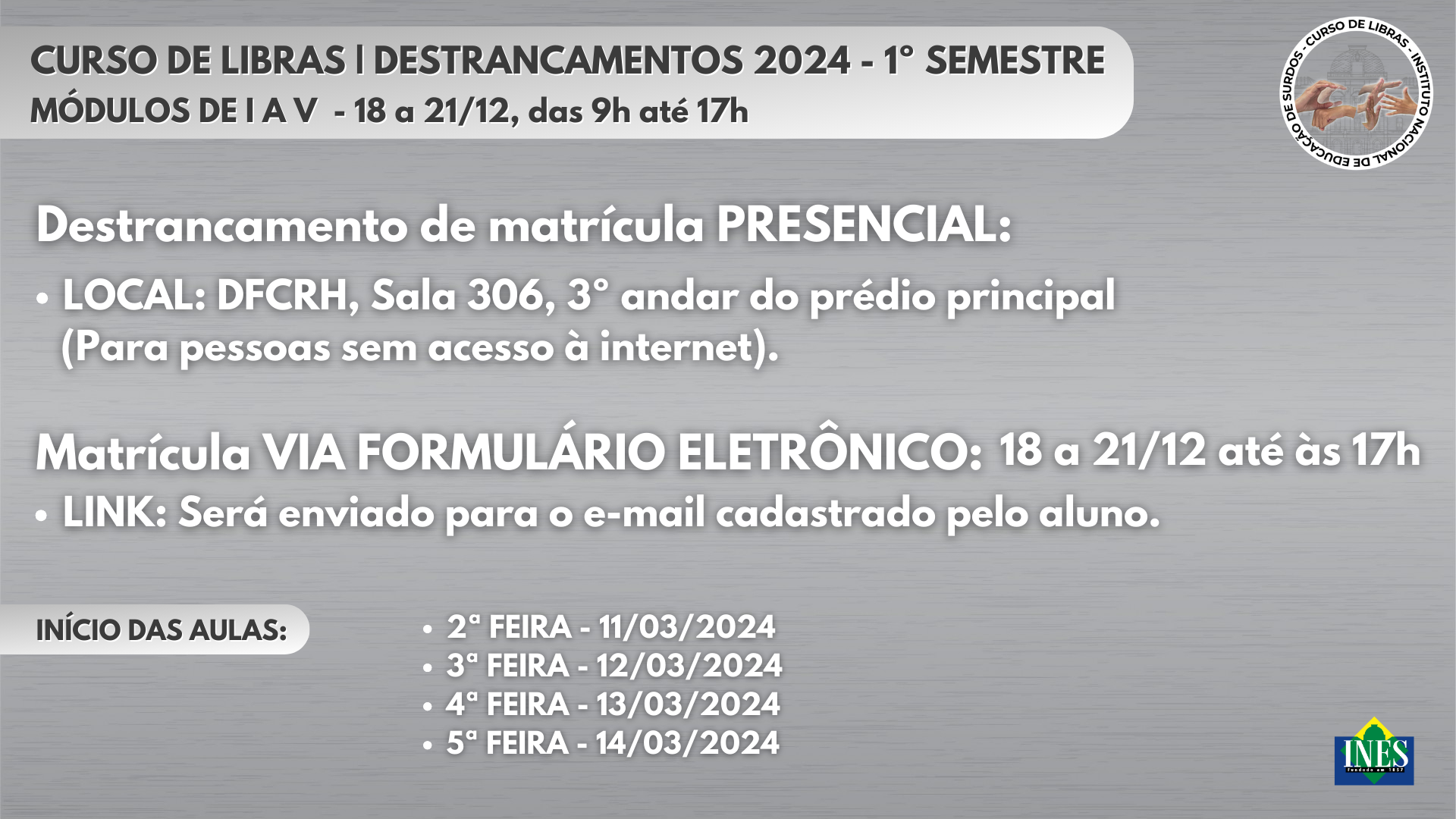 A Divisão de Formação e Capacitação de Recursos Humanos (DFCRH) do Instituto Nacional de Educação de Surdos (INES) divulgou informações sobre o Curso de Libras para o primeiro semestre de 2024. As aulas terão início na segunda semana de março. As inscrições internas – para servidores, terceirizados, alunos matriculados no Departamento de Ensino Superior (DESU) e familiares de alunos surdos do instituto – terão prazos diferentes, conforme o perfil dos interessados. Foram divulgadas também as datas e orientações para renovação e destrancamento de matrícula. Confira nos informativos a seguir: