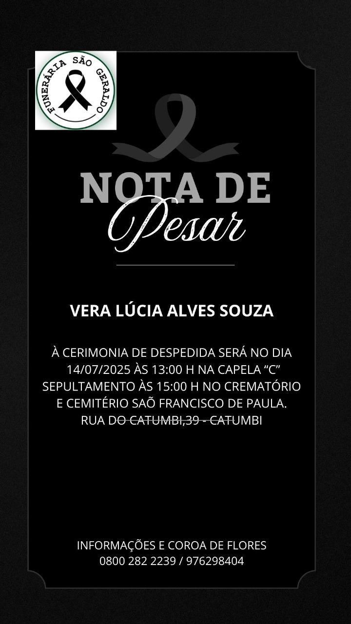O Instituto Nacional de Educação de Surdos (INES) informa, com profundo pesar, o falecimento da professora aposentada de Língua Portuguesa do INES Vera Lúcia Alves Souza. A cerimônia de despedida será realizada no dia 14 de julho de 2025, às 13 horas, na Capela “C”, com sepultamento às 15 horas, no Crematório e Cemitério São Francisco de Paula, localizado na Rua do Catumbi, 39 – Catumbi, Rio de Janeiro – RJ.