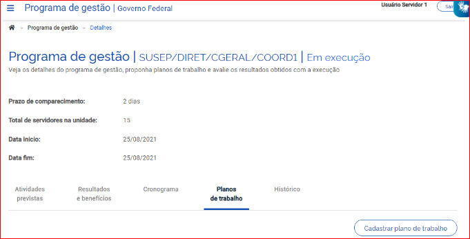 Atenção: A datas de início do plano de trabalho deve estar compreendida da vigência do Programa de Gestão onde o plano será proposto, determinada pela sua data de início e fim.