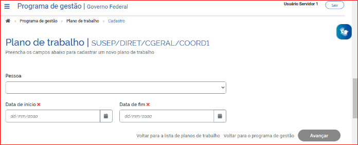 É necessário selecionar o nome do servidor que executará o plano de trabalho no campo “Pessoa”, preencher a data de início e a data de fim (duração) do plano e clicar em “Avançar”.