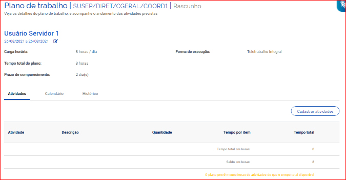 Nessa tela, o SERVIDOR deverá clicar em Cadastrar atividades e acrescentar as atividades que comporão o plano e sua descrição, preferencialmente definidas em conjunto com a chefia (conforme exposto no começo desta seção).