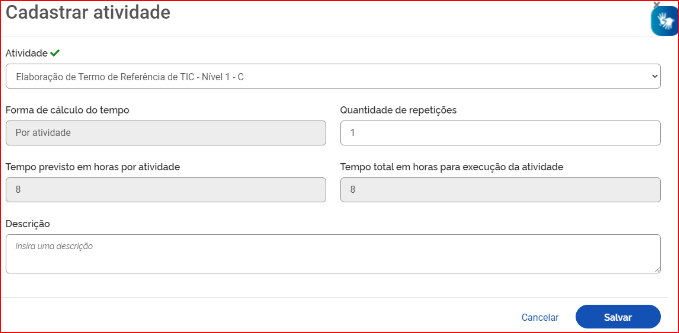 Por exemplo, suponhamos que a unidade possua uma atividade “Elaborar Nota Técnica de complexidade alta” e esta atividade seja selecionada para compor o plano de trabalho. O campo “Descrição” oferece a oportunidade de detalhá-la e inserir informações extras, por exemplo: Nota Técnica de análise XXXXX, necessária para tomar a decisão XXXX, processo SEI XXXXX.
