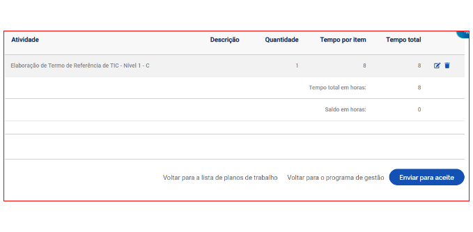 Após completar o plano de trabalho, o proponente (que poderá ser o servidor ou sua chefia) deverá clicar em “Enviar para aceite” da outra parte (o plano de trabalho representa um acordo de trabalho entre chefia e servidor que deve ser aceito por ambas as partes).