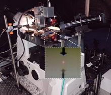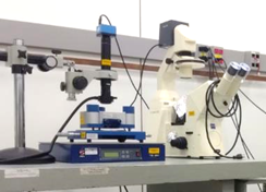 O microscópio Bruker BioScope Catalyst consiste em um microscópio invertido de fluorescência de campo amplo combinado com um AFM (do inglês atomic force microscopy, microscópio de força atômica) desenvolvido especialmente para amostras biológicas que opera de forma otimizada nos modos “Tapping” (contato intermitente) e “PeakForce” (mapa quantitativo de propriedades nanomecânicas). O equipamento em questão possui um scanner amplo (150um) que se adequa as necessidades impostas por amostras biológicas diversas.