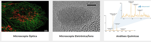 Nesta página, são divulgados todos os equipamentos disponibilizados pelo CEATIM, com a descrição detalhada de cada sistema, explanação das técnicas proporcionadas, suas aplicações, exemplos de resultados, indicações dos pesquisadores-tecnologistas e técnicos responsáveis etc.Os recursos estão organizados por meio dos seguintes agrupamentos: equipamentos de microscopia óptica (I), microscopia eletrônica/íons (II), microscopia de força atômica (III), análises Químicas (IV) e Biologia Molecular (V).