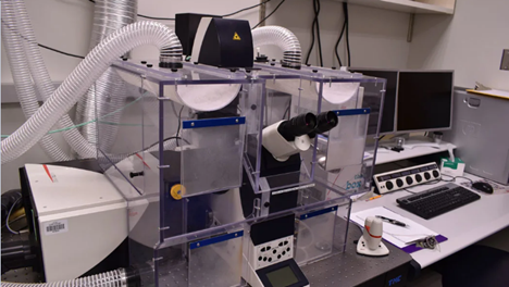 O sistema Leica TCS SP5 (True Confocal Scanner with 5 SpectroPhotometer Channels) consiste em um microscópio óptico invertido (Leica DMI6000 CS, com motorização de platina, condensador e revólveres de objetivas e filtros), equipado com um módulo de varredura confocal (convencional e ressonante), cinco detectores fotomultiplicadores, e cinco linhas de laser: Hélio-Neônio 543 nm (excitação em verde), Hélio-Neônio 594 nm (excitação em laranja), Hélio-Neônio 633 nm (excitação em vermelho), Argônio (multi-linhas: 458, 476, 488, 496 e 514 nm) e diodo azul (405 nm). O microscópio encontra-se no interior de uma câmara de incubação com controle de temperatura, umidade e tensão de CO2 (Cube&Box, Life Image Services, Suíça) para estudos com células vivas.
