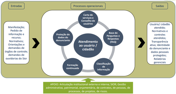 O Sistema de Gestão da Qualidade da Ouvidoria do Inmetro (SGQ-Ouvid), que é parte do Sistema de Gestão da Qualidade do Inmetro (SGQI), estabelece e mantem sob controle seis (06) processos operacionais. A figura abaixo ilustra a dinâmica de interação desses processos.