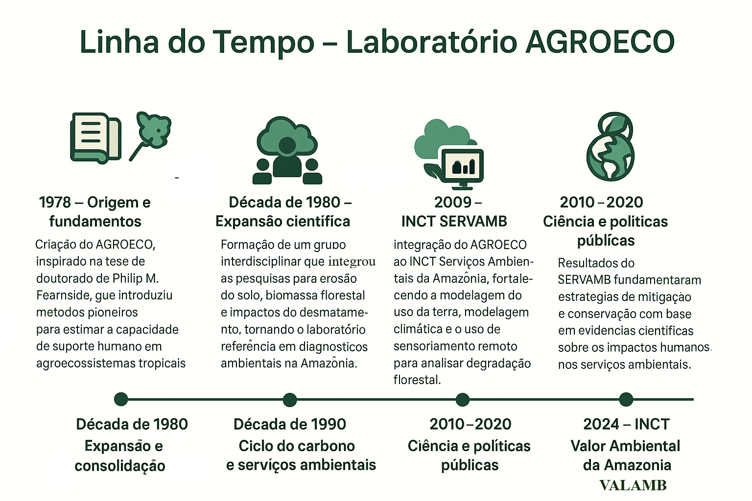 A trajetória do Laboratório AGROECO reflete mais de quatro décadas de pesquisa pioneira sobre sustentabilidade, desmatamento e serviços ecossistêmicos na Amazônia. Desde sua origem nos anos 1970, o grupo vem contribuindo com modelos e diagnósticos que integram ciência, sociedade e políticas públicas, consolidando uma linha contínua de pesquisa sob a coordenação de seu fundador desde a criação.