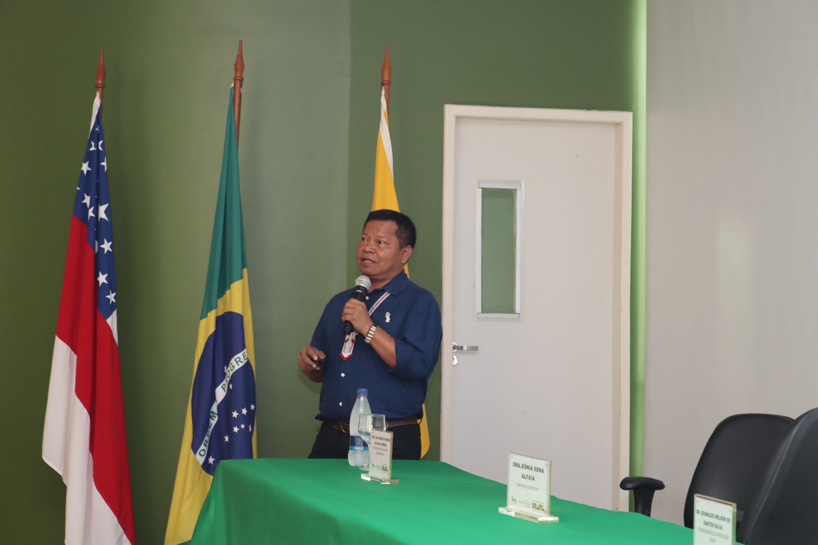 O palestrante André F. Baniwa é professor, escritor, político e ativista indígena, originário da aldeia Tucumã-Rupitã, no rio Içana, município de São Gabriel da Cachoeira (a 852 quilômetros de Manaus). Ao longo de sua palestra, compartilhou vivências pessoais e experiências culturais dos povos indígenas, enfatizando desafios relacionados às políticas públicas, mudanças climáticas e desigualdade racial, que afetam diretamente a preservação e valorização das medicinas indígenas.