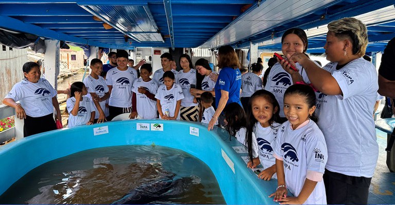 Comunidade conhecendo o peixe-boi. Foto: Fernanda Farias – Ascom Ampa