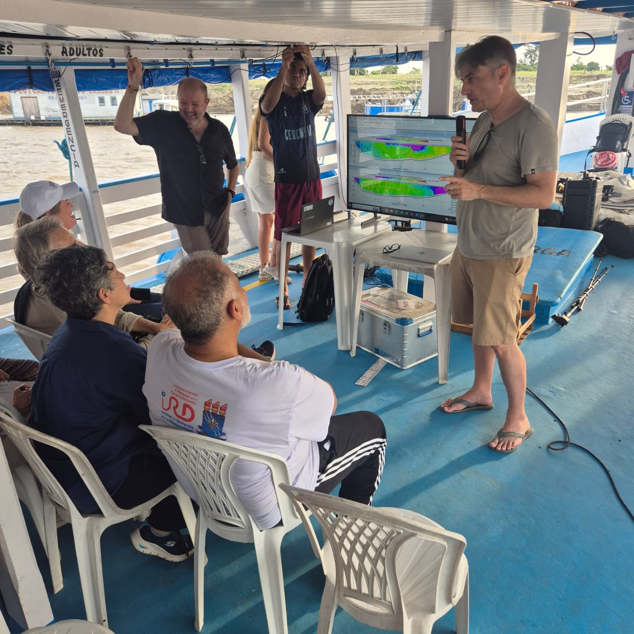 Após o embarque, a primeira atividade da caravana aconteceu em Itacoatiara (AM), com a medição da vazão do rio Amazonas em parceria com o Serviço Geológico do Brasil (SGB) e a Agência Nacional de Águas e Saneamento Básico (ANA). A equipe também apresentou conceitos de hidrologia espacial, mostrando como dados de satélites podem complementar as medições convencionais para o monitoramento dos rios.