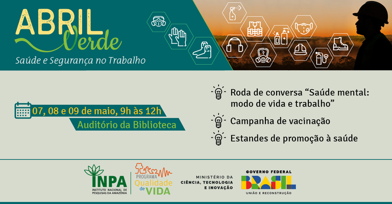 O Programa de Qualidade de Vida (PQV) do Instituto Nacional de Pesquisas da Amazônia (Inpa/MCTI) realiza a 3ª edição do Abril Verde nos dias 07, 08 e 09 de maio, em diferentes espaços do instituto. A campanha é alusiva ao mês da conscientização da prevenção de acidentes de trabalho e em comemoração ao Dia do Trabalhador.