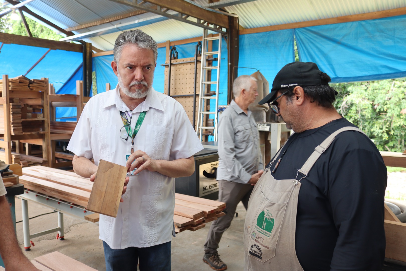 A equipe iniciou o tour na estação de Manejo Florestal, coordenada pelo pesquisador Niro Higuchi. Durante a visita, foi possível conhecer as pesquisas desenvolvidas por estudantes de mestrado e doutorado, em especial o trabalho do Instituto Nacional de Ciência e Tecnologia (INCT) Madeiras da Amazônia, que atualmente, investiga o uso de madeiras de árvores pouco exploradas comercialmente, ou não usadas em sua totalidade, como breu vermelho, pau-rainha e louro, para avaliar o potencial dos recursos florestais dessas espécies.