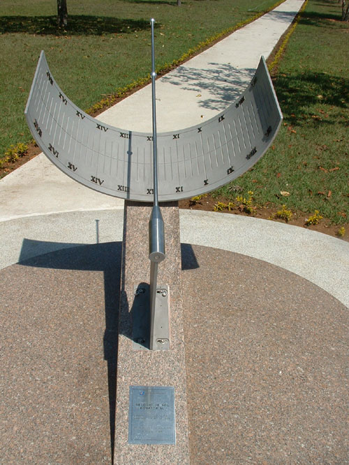 O Relógio de Sol do INPEUm relógio de sol equatorial foi inaugurado no dia 4 de agosto de 2004 na sede do INPE (São José dos Campos, SP), em comemoração ao 43º aniversário do Instituto. Os relógios de sol foram concebidos desde a Antiguidade com o propósito de marcar a passagem do tempo e são um dos instrumentos mais antigos da astronomia. A passagem do tempo, quando o Sol está acima do horizonte local, é medida através do deslocamento da sombra de objetos com formas, dimensões e orientações específicas. O deslocamento da sombra é devido à trajetória aparente diária do Sol, a qual varia também ao longo das estações do ano. Qualquer relógio de sol fornece diretamente a hora solar verdadeira do local. Para obtermos a hora legal, precisamos realizar duas correções: uma constante, devido à longitude geográfica e fuso horário do lugar, e outra variável, denominada Equação do Tempo, devido à diferença temporal entre as horas referentes ao sol verdadeiro e ao sol médio (sol fictício, que possui velocidade angular constante). É possível calcular a soma de tais correções para qualquer localidade e dia do ano. |