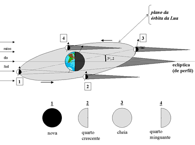 Figura 1 - A translação da lua: suas fases principais como são vistas do hemisfério sul da terra (ilustração fora de escala).