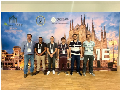 Pesquisadores trocam experiências no simpósio internacional de combustão. Da esquerda para direita: Dr. João Marcelo Vedovotto (UFU), Dr. Andrés Armando Mendiburu Zevallos (UFRGS), Dr. Fernando Luiz Sacomano Filho (USP), Dr. Rogerio Goncalves dos Santos (UNICAMP), candidato a doutor Gabriel Silva Dias (PGETE/INPE) e candidato a doutor Daniel Vigarinho de Campos (KAUST).