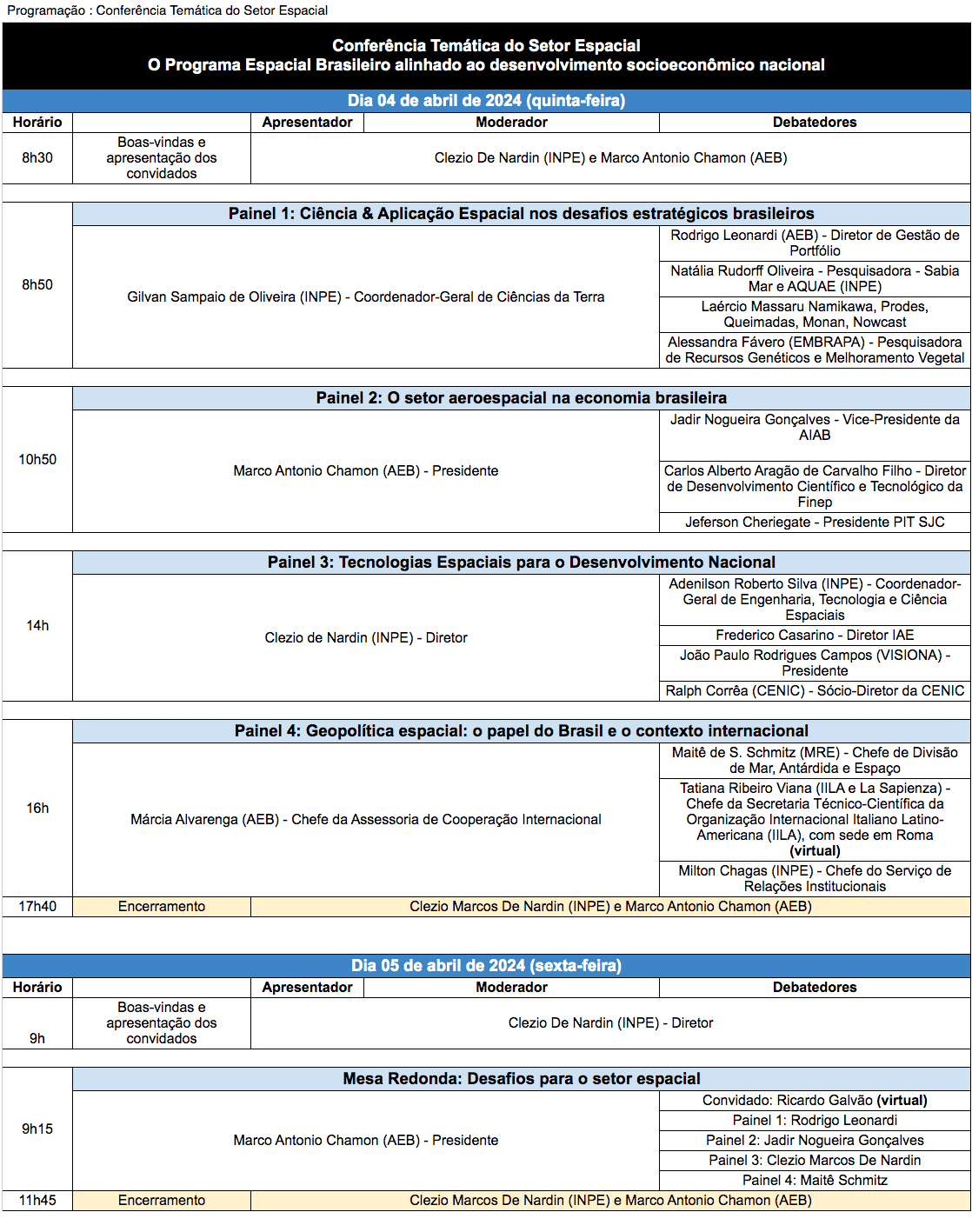 Nos dias 4 e 5 de abril, será realizada a Conferência Temática do Setor Espacial, cujo tema é “O Programa Espacial Brasileiro alinhado ao desenvolvimento socioeconômico nacional”. O evento é coorganizado pela Agência Espacial Brasileira (AEB) e pelo Instituto Nacional de Pesquisas Espaciais (INPE). Este evento ocorrerá na sede do INPE em São José dos Campos/SP.