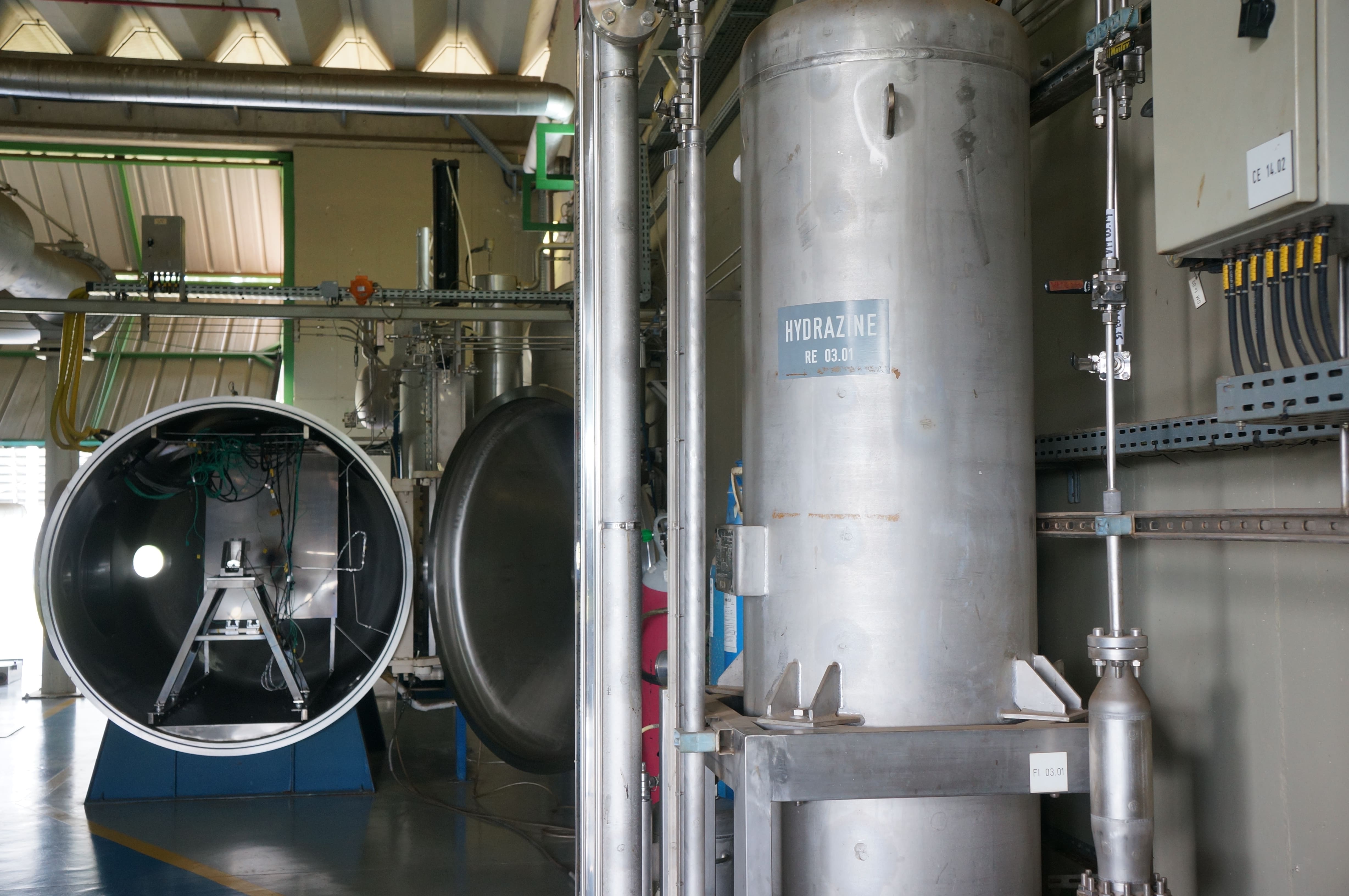 - Ao fundo, a Câmara de Vácuo do Banco de 20N; em primeiro plano, um dos tanques de propelentes do sistema (Hidrazina). Foto: Diego Rhamon