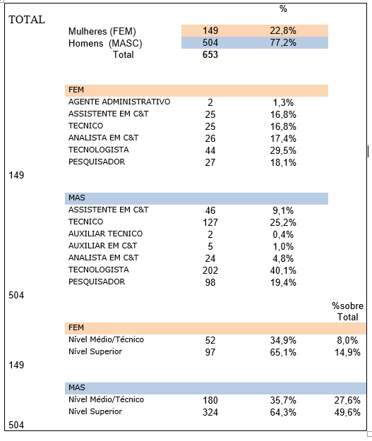 Tabela 2 – Distribuição de servidores nas Unidades do INPE, por nível (Médio/Técnico e superior) e gênero (laranja FEM, azul MASC).
