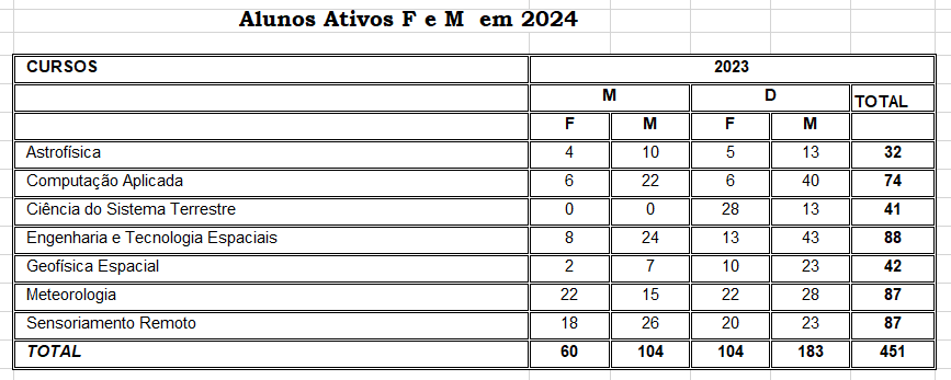 Tabela 4 – Quadro de alunos matriculados nos Cursos de PG do INPE, por gênero e níveis (Mestrado- M e doutorado – D).
