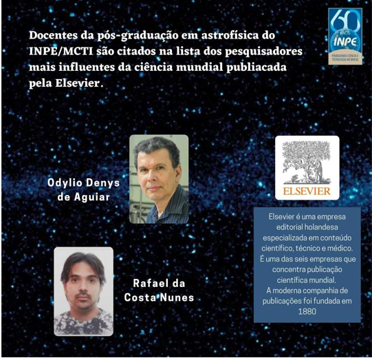 Dois docentes da pós-graduação em Astrofísica do Instituto Nacional de Pesquisas Espaciais (INPE), unidade do Ministério de Ciência, Tecnologia e Inovações (MCTI), são citados na lista dos pesquisadores mais influentes da ciência mundial, de acordo com o levantamento feito pela Elsevier. Os docentes Rafael da Costa Nunes e Odylio Denys de Aguiar são incluídos no levantamento dos pesquisadores mais influentes do último ano. A lista conta com cerca de 200.000 nomes. Na área de física & astronomia, os professores acima citados estão nas posições 587 e 4.401 no ranking dos mais citados.