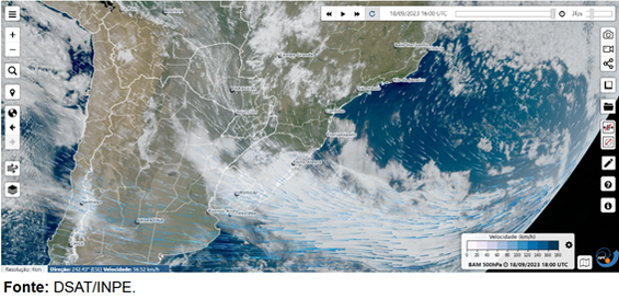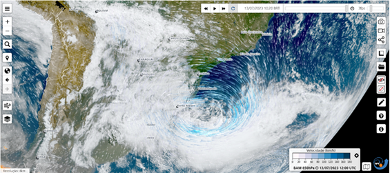 Na imagem, destaque para um ciclone extratropical atuando na região Sul do Brasil, dia 13/07/2023 - 10:10 BRT. Em conjunto com a imagem de satélite, é mostrado o campo de vento estimado pelo modelo BAM em 85h0Pa. Fonte: DSAT/INPE.