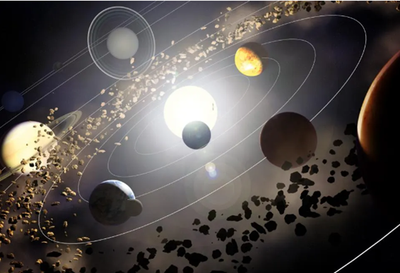 Sistema solar completo com cinturão de asteróides (planetas fora de escala!). (Fonte: https://www.forbes.com/sites/brucedorminey/2024/04/11/mass-of-early-main-asteroid-belt-was-shockingly-small-says-new-paper/?sh=3838ddf468ce).