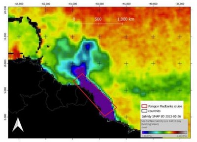 Figura 2 – Campo semanal de salinidade na superfície do mar médio estimado com dados do sensor orbital SMAP (26/05/2023). Área de amostragem do cruzeiro oceanográfico indicada pelo polígono vermelho (Crédito: Aline M. Valerio).