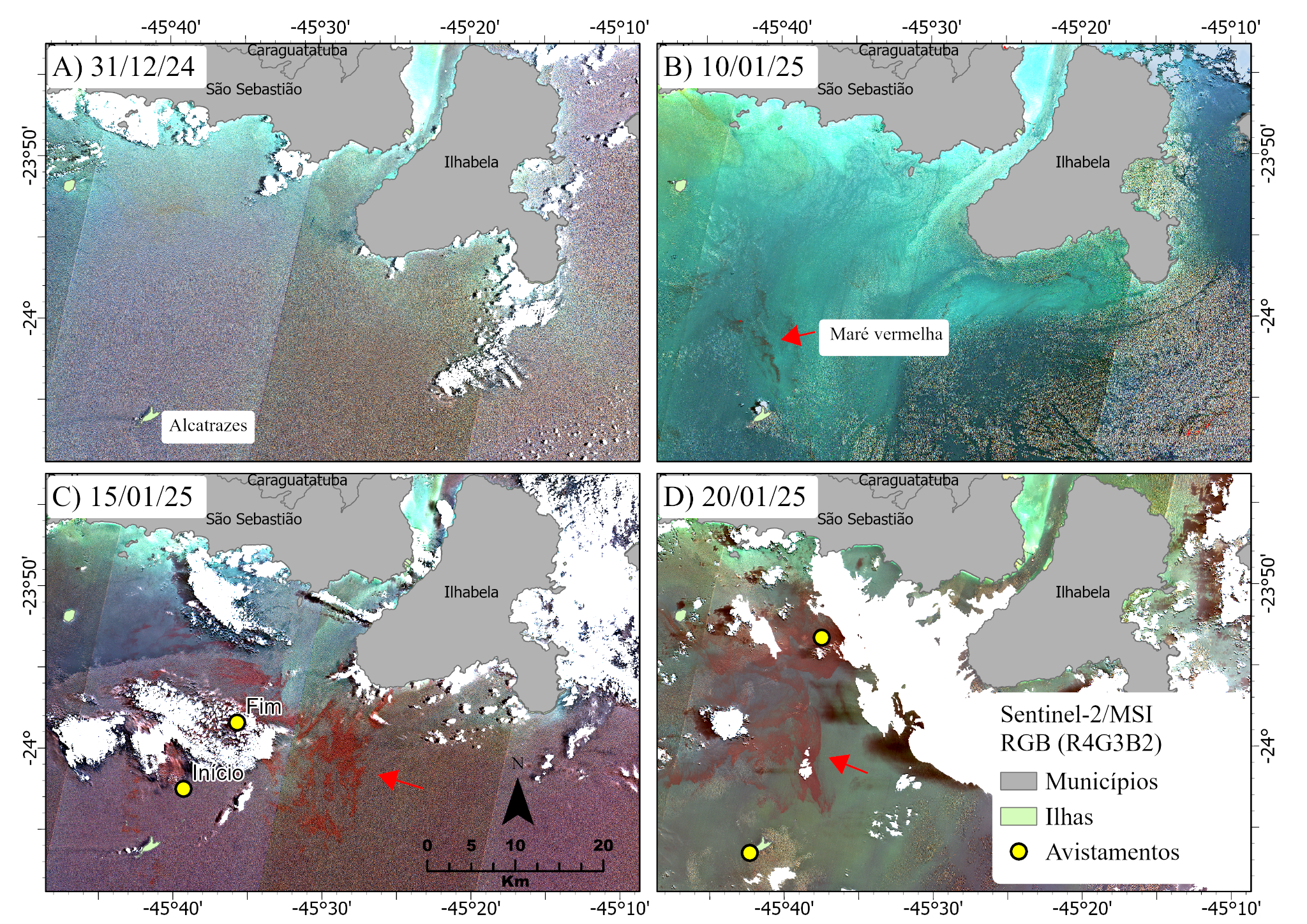 Para mais informações técnicas sobre o evento, consulte a Nota Técnica elaborada pelo LabISA/INPE, CEBIMar/USP e GCER/Mississippi State University. O INPE e seus parceiros reforçam a importância do uso de tecnologias de sensoriamento remoto para o monitoramento ambiental, garantindo a segurança das comunidades costeiras e a preservação dos ecossistemas marinhos. A população é orientada a seguir as recomendações das autoridades locais e evitar o contato com áreas onde as manchas vermelhas são visíveis.