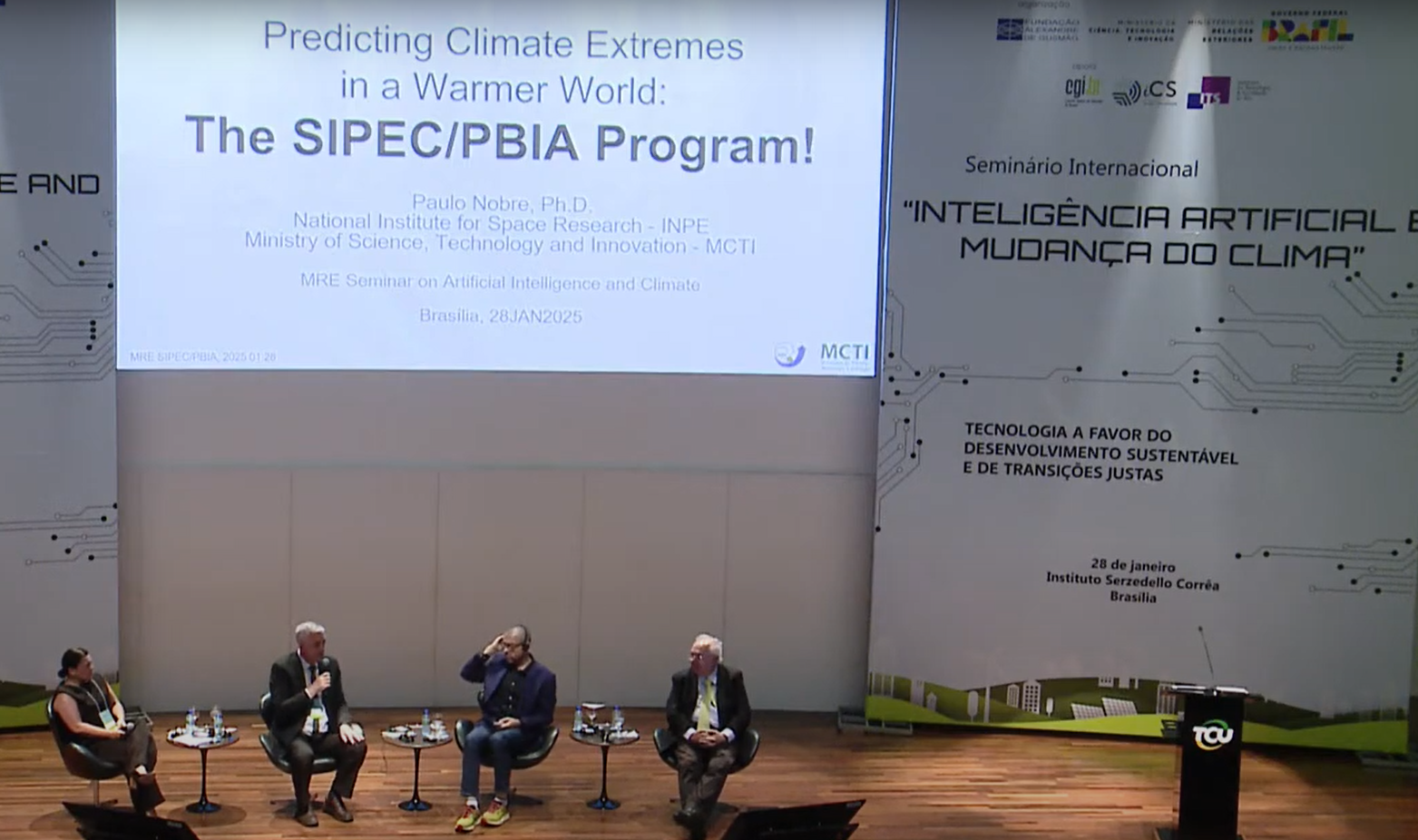 O Instituto Nacional de Pesquisas Espaciais (INPE) participou, no dia 28 de janeiro de 2025, do Seminário Internacional "Inteligência Artificial e Mudança do Clima: tecnologia a favor do desenvolvimento sustentável e de uma transição justa", realizado em Brasília. O evento, organizado em parceria entre o Ministério das Relações Exteriores (MRE), o Ministério da Ciência, Tecnologia e Inovação (MCTI) e a Fundação Alexandre de Gusmão, reuniu especialistas, autoridades e representantes de instituições nacionais e internacionais para discutir o uso da Inteligência Artificial (IA) no combate às mudanças climáticas. A abertura contou com a presença de autoridades como o Ministro Jorge Oliveira, Vice-Presidente do Tribunal de Contas da União, o Sr. James Grabert, Diretor de Mitigação da Convenção Quadro das Nações Unidas sobre Mudança do Clima, a Sra. Renata Mielli, Coordenadora do Comitê Gestor da Internet no Brasil, a Sra. Marina Silva, Ministra de Estado de Meio Ambiente e Mudança do Clima, a Sra. Luciana Santos, Ministra de Estado de Ciência, Tecnologia e Inovação, e o Embaixador Mauro Vieira, Ministro de Estado das Relações Exteriores.