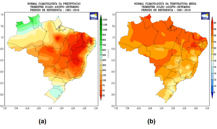 Figura 1 : Climatologia de: (a) precipitação (chuva) e (b) temperatura média do ar para o trimestre julho, agosto e setembro. Período de referência: 1981 – 2010. Fonte: INMET.