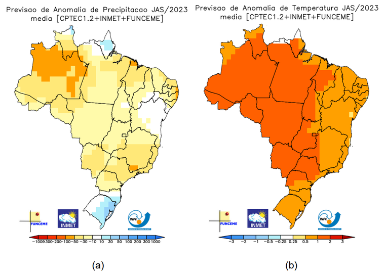 Figura 3 : Previsão de anomalias de (a) precipitação e (b) temperatura média do ar para o trimestre julho, agosto e setembro/2023, elaborada conjuntamente pelo INMET, CPTEC/INPE e FUNCEME.