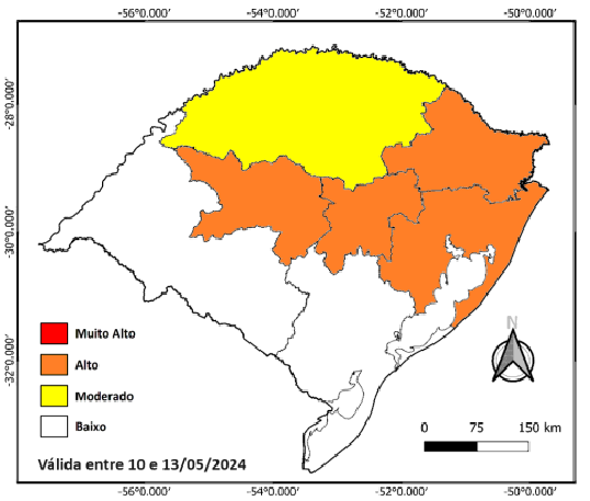 Probabilidade de ocorrência de deslizamentos em ao menos um município das mesorregiões (e/ou subdivisões regionais) indicadas. Este mapa é elaborado por uma equipe multidisciplinar levando em consideração as condições dos cenários de riscos geológicos atuais somados à previsão de chuva.