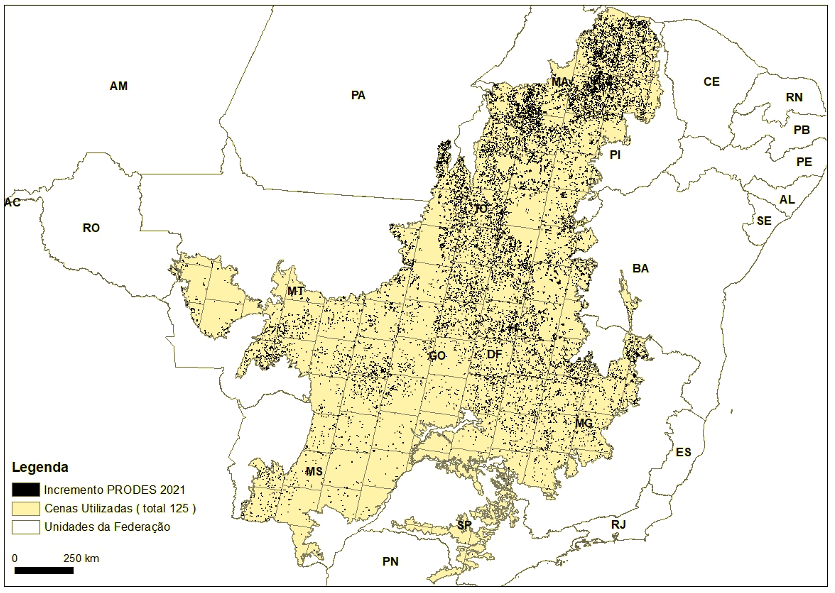 O Instituto Nacional de Pesquisas Espaciais (INPE), unidade vinculada ao Ministério de Ciência, Tecnologia e Inovações (MCTI), concluiu o mapeamento da supressão vegetação nativa no bioma Cerrado, atualizado pelo novo limite do bioma definido pelo IBGE em 2019. O valor mapeado foi de 8.531,44 km 2 de corte raso no período de agosto de 2020 a julho de 2021. Esse valor representa um aumento de 7,9% em relação ao valor apurado pelo PRODES 2020 que foi de 7.905,16 km 2 para o bioma Cerrado.