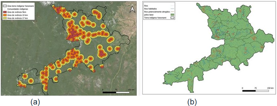 Figura – a) Estimativa de área de vivência das comunidades indígenas na Terra Indígena Yanomami (TIY); b) Principais acessos geográficos na área da TIY. Fonte: Observatório de Clima e Saúde/Fiocruz, baseado em dados da FUNAI de localização de aldeias e LIGAS/UVA.