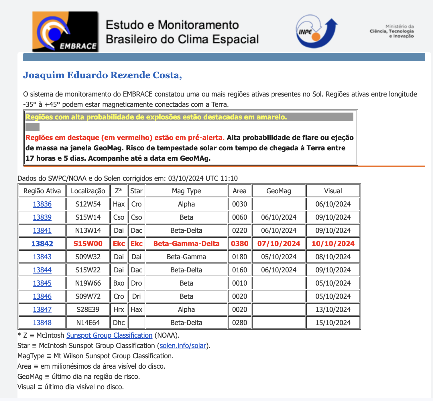 Na manhã do dia 3 de outubro o EMBRACE emitiu um e-mail de alerta para a região AR3842:
