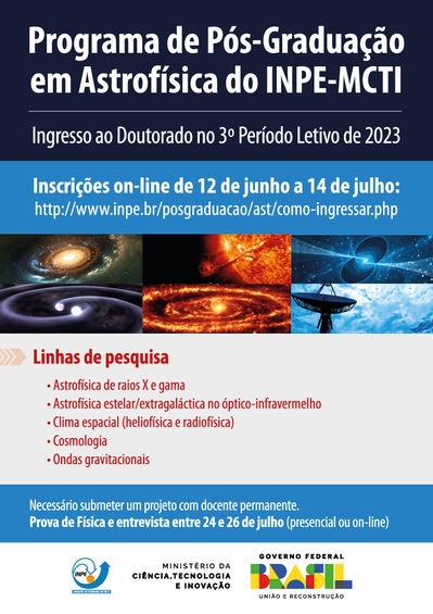 Estão abertas as inscrições ao Curso de Doutorado do Programa de Pós-Graduação em Astrofísica do INPE para ingresso no 3º Período Letivo de 2023, o qual se iniciará em 18 de setembro.