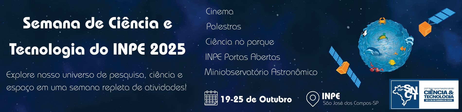 De 19 a 25 de outubro, o Instituto Nacional de Pesquisas Espaciais (INPE) realizará a Semana de Ciência e Tecnologia 2025. A programação faz parte da 22ª Semana Nacional de Ciência e Tecnologia (SNCT), promovida pelo Ministério da Ciência, Tecnologia e Inovação (MCTI), que em 2025 traz como tema “Planeta Água: cultura oceânica para enfrentar as mudanças climáticas no meu território”.
