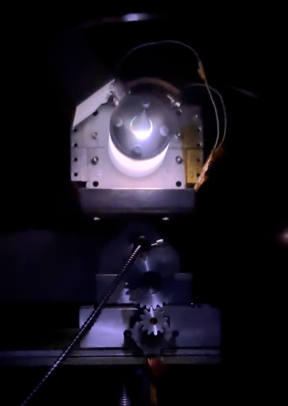 - Figura 2: Vista frontal do VSI-PPT (Propulsor de Plasma Pulsado com Impulso Específico Variável) operando em vácuo durante o teste no modo de alto impulso específico em 21 de fevereiro de 2024. (Imagem cedida por Marcelo Renato Anselmo).